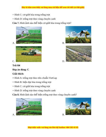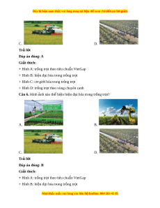 Đây là bản xem th , vu ử i lòng mua tài li u ệ đ xe ể m chi ti t (c ế ó l i ờ gi i ả ) C. D. Trả l i ờ Đáp án đúng: A Giải thích: + Hình A: tr ng t ồ r t ọ theo tiêu chu n ẩ VietGap + Hình B: hi n đ ệ i ạ hóa trong tr ng t ồ r t ọ + Hình C: c gi ơ i ớ hóa trong tr ng t ồ r t ọ + Hình D: tr ng t ồ r t ọ theo vùng chuyên canh Câu 6. Hình nh ả nào th hi ể n hi ệ n đ ệ i ạ hóa trong tr ng t ồ r t ọ ? A. B. C. D. Trả l i ờ Đáp án đúng: B Giải thích: + Hình A: tr ng t ồ r t ọ theo tiêu chu n ẩ VietGap + Hình B: hi n đ ệ i ạ hóa trong tr ng t ồ r t ọ M i