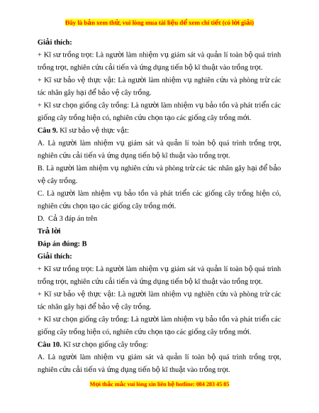 Đây là bản xem th , vu ử i lòng mua tài li u ệ đ xe ể m chi ti t (c ế ó l i ờ gi i ả ) Giải thích: + Kĩ sư tr ng ồ tr t ọ : Là ngư i ờ làm nhi m ệ v ụ giám sát và qu n ả lí toàn b ộ quá trình trồng tr t ọ , nghiên c u ứ c i ả ti n và ế ng d ứ ng ụ ti n ế b kĩ ộ thu t ậ vào tr ng t ồ r t ọ . + Kĩ sư b o ả vệ th c ự v t ậ : Là ngư i ờ làm nhi m ệ vụ nghiên c u ứ và phòng tr ừ các tác nhân gây h i ạ đ b ể o ả v cây t ệ r ng. ồ + Kĩ sư ch n ọ gi ng ố cây tr ng: ồ Là ngư i ờ làm nhi m ệ v ụ b o ả t n ồ và phát tri n ể các