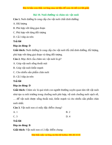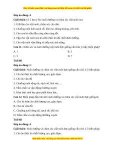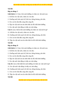 Giải thích: Chăm sóc là quá trình con ngư i ờ thư ng ờ xuyên quan tâm t i ớ v t ậ nuôi như t o ạ ra môi trư ng ờ trong chu ng ồ nuôi phù h p, ợ v ệ sinh chu ng ồ nuôi s ch ạ s , ẽ … để v t ậ nuôi đư c ợ s ng ố tho i ả mái, kh e ỏ m nh ạ và cho nhi u ề s n ả ph m ẩ chăn nuôi nhất. Câu 3. V t ậ nuôi non có m y đ ấ c đi ặ m ể chung? A. 1 B. 2 C. 3 D. 4 Trả l i ờ Đáp án đúng: B Giải thích: V t