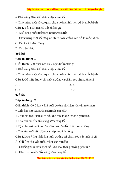 Đây là bản xem th , vu ử i lòng mua tài li u ệ đ xe ể m chi ti t (c ế ó l i ờ gi i ả ) + Khả năng đi u t ề i t ế thân nhi t ệ ch a t ư ốt. + Ch c ứ năng m t ộ số cơ quan ch a hoàn ư ch nh nên d ỉ b ễ m ị c b ắ nh. ệ Câu 4. V t ậ nuôi non có đ c ặ đi m ể gì? A. Khả năng đi u t ề i t ế thân nhi t ệ ch a t ư ốt. B. Ch c năng ứ m t ộ số c quan ch ơ a ư hoàn ch nh nên d ỉ b ễ m ị c ắ b nh. ệ C. Cả A và B đ u đúng ề D. Đáp án khác Trả l i ờ Đáp án đúng: C Giải thích: V t ậ nuôi non có 2 đ c ặ đi m ể chung: + Khả năng đi u t ề i t ế thân nhi t ệ ch a t ư ốt. + Ch c ứ năng m t ộ số cơ quan ch a hoàn ư ch nh nên d ỉ b ễ m ị c b ắ nh. ệ