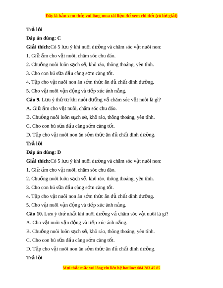 ẽ, khô ráo, thông thoáng, yên tĩnh. 3. Cho con bú s a ữ đ u càng ầ s m ớ càng t t ố . 4. T p cho v ậ t ậ nuôi non ăn s m ớ th c ăn ứ đ ch ủ t ấ dinh dư ng. ỡ 5. Cho v t ậ nuôi v n ậ đ ng và t ộ i p xúc ánh n ế ng. ắ Câu 7. L u ý t ư h hai ứ khi nuôi dư ng v ỡ chăm ầ sóc v t ậ nuôi là gì? A. Giữ m ấ cho v t