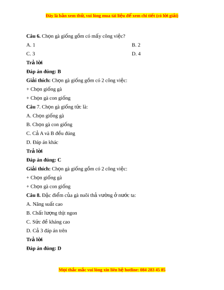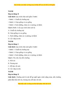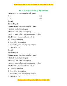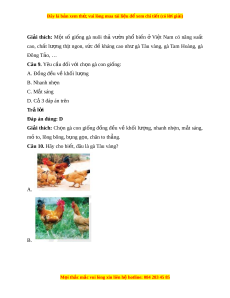 giống gồm có 2 công vi c: ệ + Ch n ọ gi ng gà ố + Ch n ọ gà con giống Câu 8. Đặc đi m ể c a ủ gà nuôi th v ả ư ng ờ ở nư c t ớ a: A. Năng su t ấ cao B. Ch t ấ lư ng t ợ h t ị ngon C. S c đ ứ kháng cao ề D. C 3 đáp án ả trên Trả l i ờ Đáp án đúng: D M i