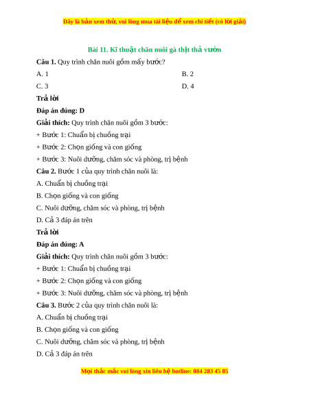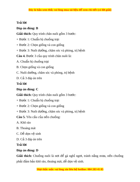 Giải thích: Quy trình chăn nuôi g m ồ 3 bư c: ớ + Bư c 1: ớ Chu n b ẩ chu ị ồng tr i ạ + Bư c 2: ớ Ch n ọ gi ng và ố con gi ng ố + Bư c 3: ớ Nuôi dư ng, ỡ chăm sóc và phòng, tr b ị nh ệ Câu 5. Yêu c u c ầ a ủ n n chu ề ng: ồ A. Khô ráo B. Thoáng mát C. D d ễ n v ọ ệ sinh D. C 3 đáp án ả trên Trả l i ờ Đáp án đúng: D