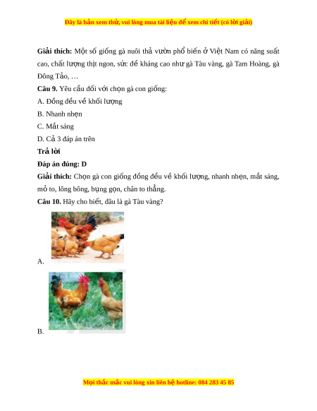 giống gồm có 2 công vi c: ệ + Ch n ọ gi ng gà ố + Ch n ọ gà con giống Câu 7. Ch n ọ gà giống t c l ứ à: A. Ch n gi ọ ống gà B. Ch n gà ọ con giống C. Cả A và B đ u đúng ề D. Đáp án khác Trả l i ờ Đáp án đúng: C Giải thích: Ch n gà ọ