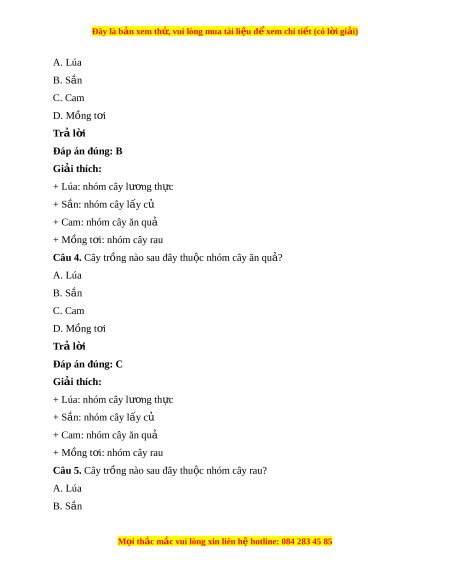 Đây là bản xem th , vu ử i lòng mua tài li u ệ đ xe ể m chi ti t (c ế ó l i ờ gi i ả ) A. Lúa B. S n ắ C. Cam D. Mồng t i ơ Trả l i ờ Đáp án đúng: B Giải thích: + Lúa: nhóm cây lư ng t ơ h c ự + S n: ắ nhóm cây l y c ấ ủ + Cam: nhóm cây ăn quả + Mồng t i ơ : nhóm cây rau