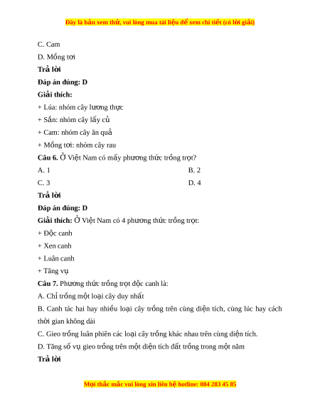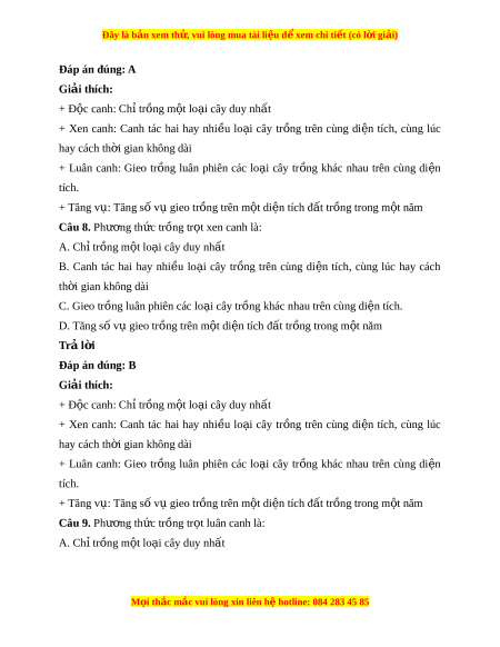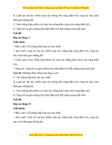 Giải thích: Ở Việt Nam có 4 phư ng t ơ h c t ứ r ng t ồ r t ọ : + Đ c ộ canh + Xen canh + Luân canh + Tăng vụ Câu 7. Phư ng ơ th c ứ tr ng t ồ r t ọ đ c canh l ộ à: A. Chỉ trồng m t ộ lo i ạ cây duy nh t ấ B. Canh tác hai hay nhi u ề lo i ạ cây tr ng ồ trên cùng di n