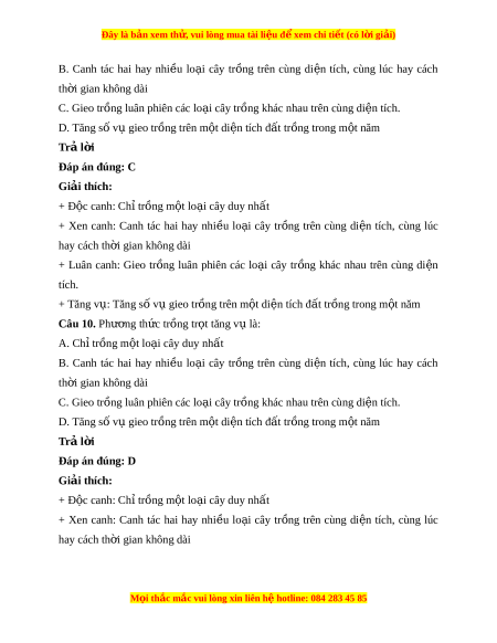 ồ khác nhau trên cùng di n ệ tích. + Tăng v : ụ Tăng s v ố gi ụ eo trồng trên m t ộ di n t ệ ích đ t ấ tr ng t ồ rong m t ộ năm Câu 8. Phư ng ơ th c ứ tr ng t ồ r t ọ xen canh là: A. Chỉ trồng m t ộ lo i ạ cây duy nh t ấ B. Canh tác hai hay nhi u ề lo i ạ cây tr ng ồ trên cùng di n
