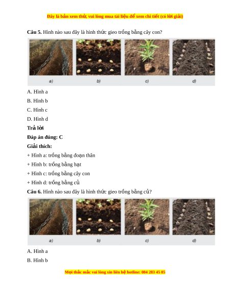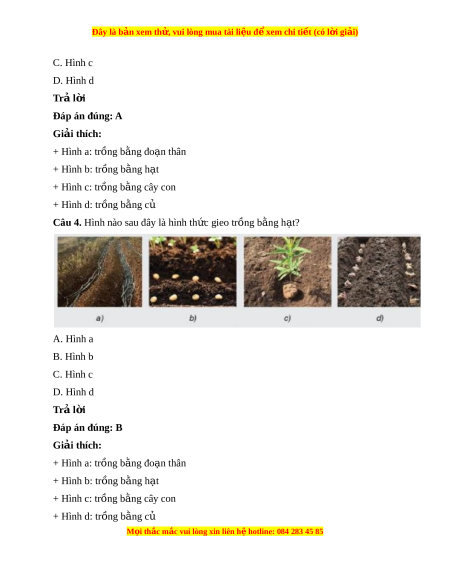 Đây là bản xem th , vu ử i lòng mua tài li u ệ đ xe ể m chi ti t (c ế ó l i ờ gi i ả ) C. Hình c D. Hình d Trả l i ờ Đáp án đúng: D Giải thích: + Hình a: tr ng b ồ ng ằ đo n t ạ hân + Hình b: tr ng b ồ ng ằ h t ạ + Hình c: tr ng b ồ ng ằ cây con + Hình d: tr ng b ồ ng ằ củ