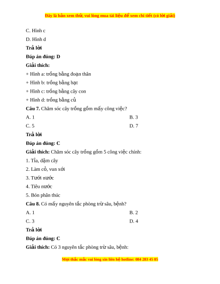 Đây là bản xem th , vu ử i lòng mua tài li u ệ đ xe ể m chi ti t (c ế ó l i ờ gi i ả ) C. Hình c D. Hình d Trả l i ờ Đáp án đúng: A Giải thích: + Hình a: tr ng b ồ ng ằ đo n t ạ hân + Hình b: tr ng b ồ ng ằ h t ạ + Hình c: tr ng b ồ ng ằ cây con + Hình d: tr ng b ồ ng ằ củ