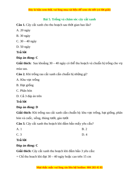 bón và cuốc, xẻng, thùng tư i ớ , gáo tư i ớ Câu 3. Cây c i ả xanh thu ho ch khi ạ đ m ả b o m ả y yêu c ấ u? ầ A. 1 B. 2 C. 3 D. 4 Trả l i ờ Đáp án đúng: C Giải thích: Cây c i ả xanh thu ho ch ạ khi đ m ả b o ả 3 yêu c u: ầ + Ch t ỉ hu hoach khi đ t ạ 30 – 40 ngày ho c ặ cao trên 15 cm M i