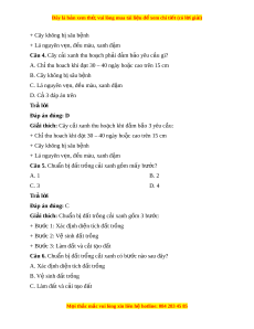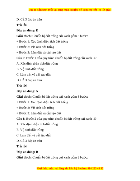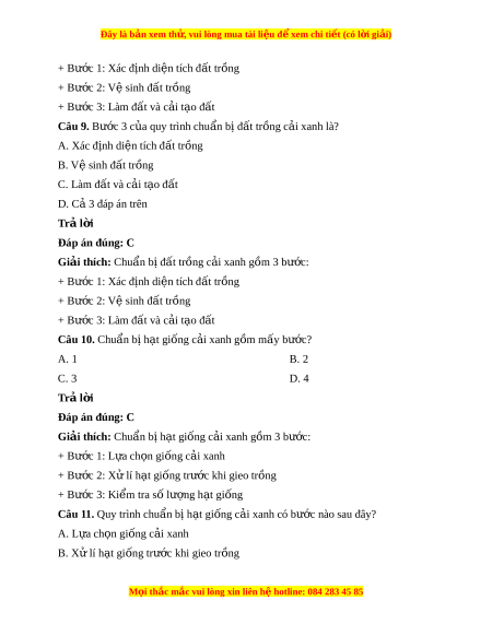 Đây là bản xem th , vu ử i lòng mua tài li u ệ đ xe ể m chi ti t (c ế ó l i ờ gi i ả ) + Bư c 1: ớ Xác đ nh di ị n t ệ ích đ t ấ tr ng ồ + Bư c 2: ớ V s ệ inh đ t ấ tr ng ồ + Bư c 3: ớ Làm đ t ấ và c i ả t o ạ đ t ấ Câu 9. Bư c 3 c ớ a ủ quy trình chu n b ẩ đ ị t ấ tr ng c ồ i ả xanh là? A. Xác đ nh d ị i n t ệ ích đ t ấ tr ng ồ B. V s ệ inh đ t ấ tr ng ồ C. Làm đ t ấ và c i ả t o đ ạ t ấ D. C 3 đáp án ả trên Trả l i ờ Đáp án đúng: C