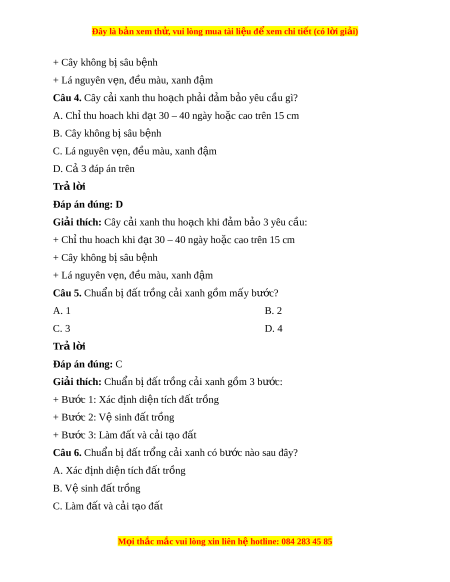 Đây là bản xem th , vu ử i lòng mua tài li u ệ đ xe ể m chi ti t (c ế ó l i ờ gi i ả ) + Cây không b s ị âu b nh ệ + Lá nguyên v n, đ ẹ u m ề àu, xanh đ m ậ Câu 4. Cây c i ả xanh thu ho ch ph ạ i ả đ m ả b o ả yêu c u gì ầ ? A. Chỉ thu hoach khi đ t ạ 30 – 40 ngày ho c ặ cao trên 15 cm B. Cây không b s ị âu b nh ệ C. Lá nguyên v n, đ ẹ u ề màu, xanh đ m ậ D. C 3 đáp án ả trên Trả l i ờ Đáp án đúng: D Giải thích: Cây c i ả xanh thu ho ch ạ khi đ m ả b o ả 3 yêu c u: ầ + Ch t ỉ hu hoach khi đ t ạ 30 – 40 ngày ho c ặ cao trên 15 cm + Cây không b s ị âu b nh ệ + Lá nguyên v n, đ ẹ u m ề àu, xanh đ m ậ