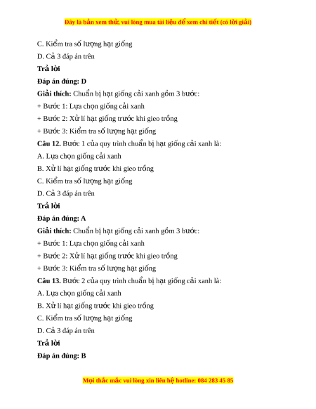 Câu 13. B c 2 c a quy trình chu n b h t gi ng c i xanh là:ướ ủ ẩ ị ạ ố ả