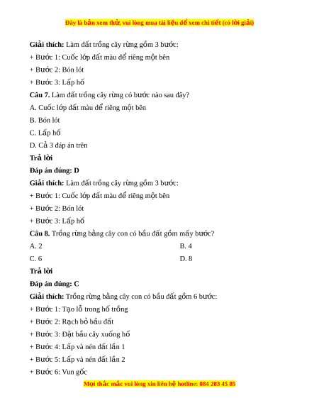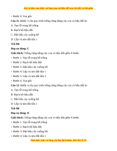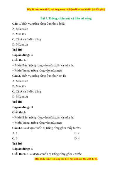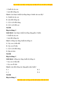 Đây là bản xem th , vu ử i lòng mua tài li u ệ đ xe ể m chi ti t (c ế ó l i ờ gi i ả ) Bài 7. Tr ng, chăm ồ sóc và b o v ả r ệ ng ừ Câu 1. Th i ờ v t ụ r ng r ồ ng ừ m ở i n B ề c l ắ à: A. Mùa xuân B. Mùa thu C. Cả A và B đ u đúng ề D. Mùa m a ư Trả l i ờ Đáp án đúng: C Giải thích: + Mi n ề B c: ắ tr ng r ồ ng vào m ừ ùa xuân và mùa thu + Mi n ề Trung: trồng r ng vào m ừ ùa m a ư Câu 2. Th i ờ v t ụ r ng r ồ ng ừ m ở i n N ề am là: A. Mùa xuân B. Mùa thu C. Cả A và B đ u đúng ề D. Mùa m a ư Trả l i ờ Đáp án đúng: D Giải thích: + Mi n ề B c: ắ tr ng r ồ ng vào m ừ ùa xuân và mùa thu + Mi n ề Trung: trồng r ng vào m ừ ùa m a ư Câu 3. Giai đo n ạ chu n b ẩ t ị r ng r ồ ng g ừ m ồ m y b ấ ư c? ớ A. 1 B. 2 C. 3 D. 4 Trả l i ờ Đáp án đúng: B