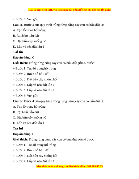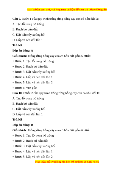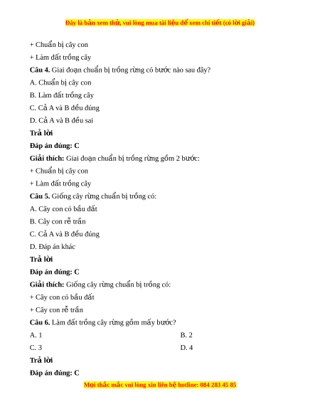 Đây là bản xem th , vu ử i lòng mua tài li u ệ đ xe ể m chi ti t (c ế ó l i ờ gi i ả ) + Chu n b ẩ cây con ị + Làm đ t ấ tr ng cây ồ Câu 4. Giai đo n ạ chu n b ẩ t ị r ng r ồ ng có ừ bư c nào s ớ au đây? A. Chuẩn b cây ị con B. Làm đ t ấ tr ng cây ồ C. Cả A và B đ u đúng ề D. C ả A và B đ u s ề ai Trả l i ờ Đáp án đúng: C