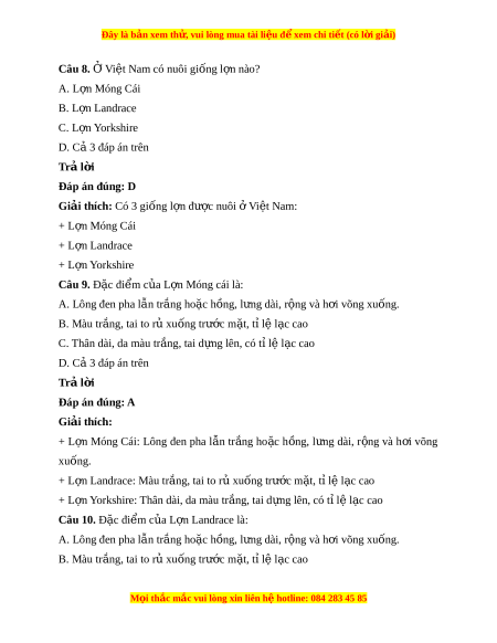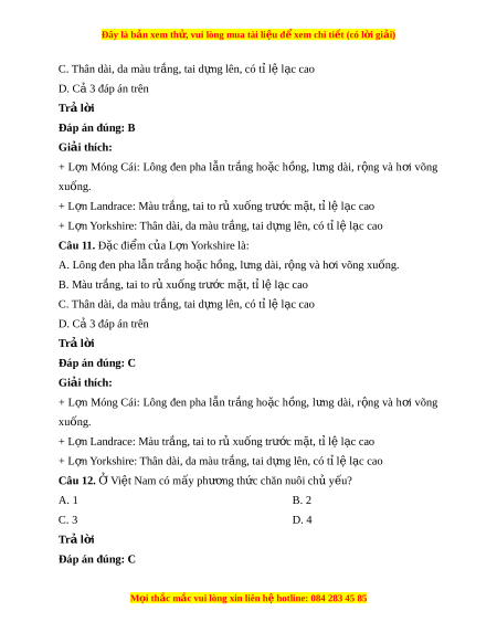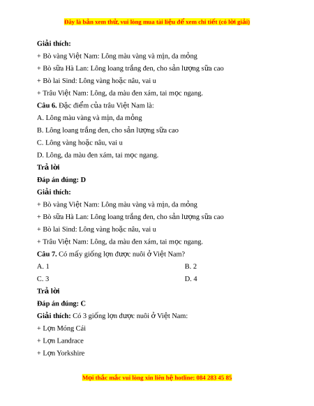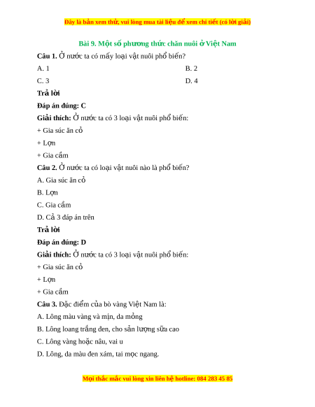 Đây là bản xem th , vu ử i lòng mua tài li u ệ đ xe ể m chi ti t (c ế ó l i ờ gi i ả ) Bài 9. M t ộ số phư ng t ơ h c chăn n ứ uôi ở Vi t ệ Nam Câu 1. Ở nư c ớ ta có mấy lo i ạ v t ậ nuôi ph bi ổ n? ế A. 1 B. 2 C. 3 D. 4 Trả l i ờ Đáp án đúng: C