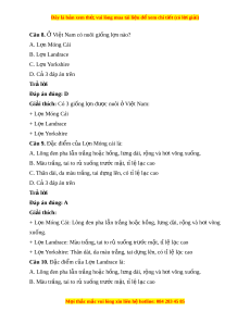 Giải thích: Có 3 giống l n đ ợ ư c ợ nuôi ở Vi t ệ Nam: + L n M ợ óng Cái + L n L ợ andrace + L n ợ Yorkshire Câu 9. Đặc đi m ể c a ủ L n M ợ óng cái là: A. Lông đen pha lẫn tr ng ắ ho c ặ h ng, l ồ ng dài ư , r ng và h ộ i ơ võng xu ng. ố B. Màu tr ng, t ắ ai to r xu ủ ng t ố rư c ớ m t ặ , t l ỉ l ệ c cao ạ