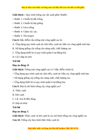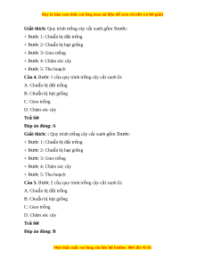 Giải thích: : Quy trình tr ng cây c ồ i ả xanh g m ồ 5bư c: ớ + Bư c 1: ớ Chu n b ẩ đ ị t ấ tr ng ồ + Bư c 2: ớ Chu n b ẩ h ị t ạ giống + Bư c 3: ớ Gieo trồng + Bư c 4: ớ Chăm sóc cây + Bư c 5: ớ Thu ho ch ạ Câu 8. Đặc đi m ể c a ủ trồng tr t ọ công ngh cao ệ là: A. ng d Ứ ng