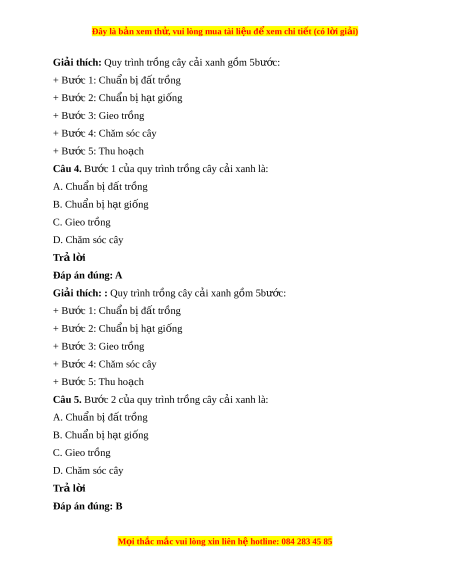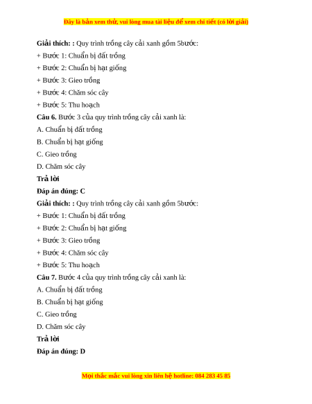 Giải thích: : Quy trình tr ng cây c ồ i ả xanh g m ồ 5bư c: ớ + Bư c 1: ớ Chu n b ẩ đ ị t ấ tr ng ồ + Bư c 2: ớ Chu n b ẩ h ị t ạ giống + Bư c 3: ớ Gieo trồng + Bư c 4: ớ Chăm sóc cây + Bư c 5: ớ Thu ho ch ạ Câu 7. Bư c 4 c ớ a ủ quy trình tr ng cây ồ c i ả xanh là: A. Chuẩn b đ ị t ấ tr ng ồ B. Chu n b ẩ h ị t ạ giống C. Gieo tr ng ồ D. Chăm sóc cây Trả l i ờ Đáp án đúng: D M i