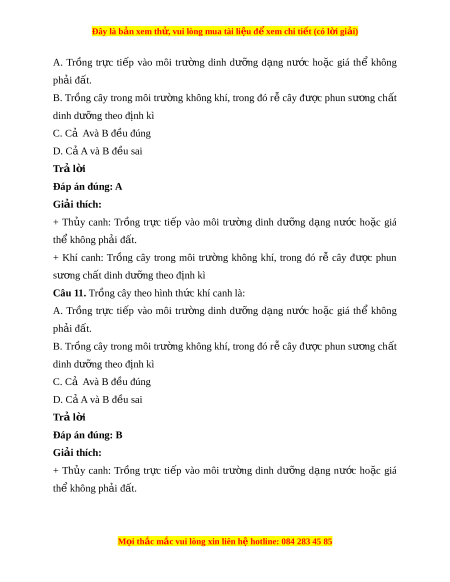 Câu 9. Đâu là mô hình tr ng cây công ngh ồ cao? ệ A. Th y ủ canh B. Khí canh C. Cả Avà B đ u đúng ề D. Đáp án khác Trả l i ờ Đáp án đúng: C
