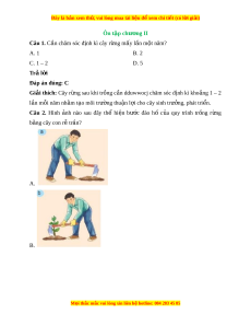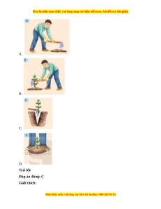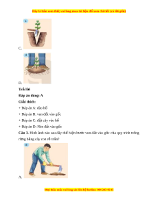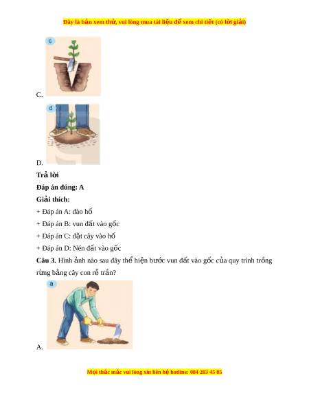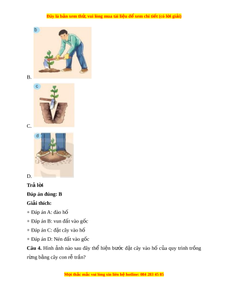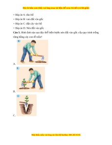 Đây là bản xem th , vu ử i lòng mua tài li u ệ đ xe ể m chi ti t (c ế ó l i ờ gi i ả ) B. C. D. Trả l i ờ Đáp án đúng: B Giải thích: + Đáp án A: đào hố + Đáp án B: vun đ t ấ vào g c ố + Đáp án C: đ t ặ cây vào hố + Đáp án D: Nén đ t ấ vào g c ố Câu 4. Hình nh ả nào sau đây thể hi n ệ bư c ớ đ t ặ cây vào hố c a ủ quy trình tr ng ồ r ng b ừ ng ằ cây con r t ễ rần? M i ọ th c ắ m c