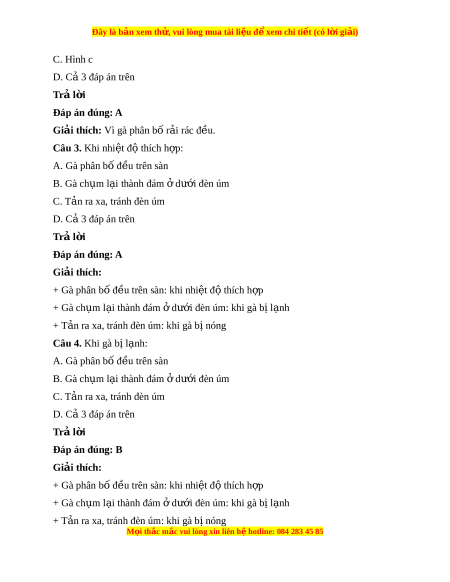 Giải thích: Vì gà phân bố r i ả rác đ u. ề Câu 3. Khi nhi t ệ đ t ộ hích h p: ợ A. Gà phân bố đ u ề trên sàn B. Gà ch m ụ l i ạ thành đám d ở ư i ớ đèn úm C. T n r ả a xa, tránh đèn úm D. C 3 đáp án ả trên Trả l i ờ Đáp án đúng: A Giải thích: + Gà phân b đ ố u t ề rên sàn: khi nhi t ệ đ t ộ hích h p ợ + Gà ch m ụ l i ạ thành đám d ở ư i ớ đèn úm: khi gà b l ị nh ạ + T n r