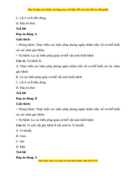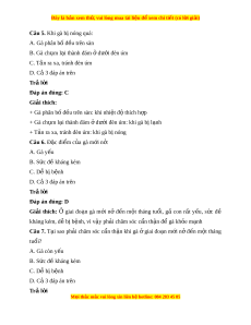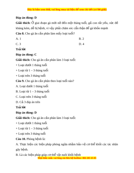 Giải thích: Cho gà ăn cần phân làm 3 lo i ạ tu i ổ : + Lo i ạ dư i ớ 1 tháng tu i ổ + Lo i ạ t 1 – 3 t ừ háng tu i ổ + Lo i ạ trên 3 tháng tu i ổ Câu 10. Phòng b nh l ệ à: A. Th c ự hi n ệ các bi n ệ pháp phòng ng a ừ nh m ằ b o ả vệ cơ thể kh i ỏ các tác nhân gây bệnh. B. Là các bi n pháp gi ệ úp c t ơ h v ể t ậ nuôi kh i ỏ b nh ệ M i ọ th c ắ m c