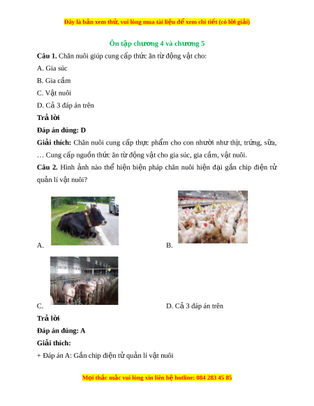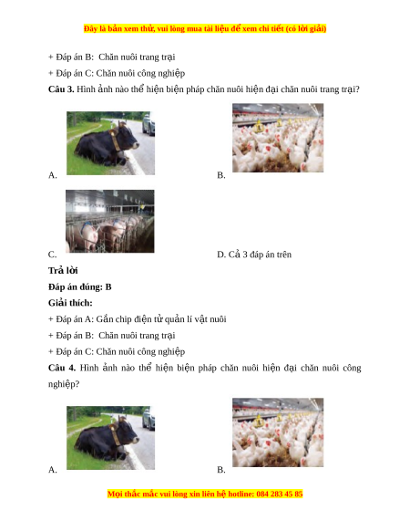 Giải thích: Chăn nuôi cung c p ấ th c ự ph m ẩ cho con như i ờ như th tị, tr ng, ứ s a, ữ … Cung c p ngu ấ ồn th c ứ ăn t đ ừ ng v ộ t ậ cho gia súc, gia c m ầ , v t ậ nuôi. Câu 2. Hình nh ả nào thể hi n ệ bi n ệ pháp chăn nuôi hi n ệ đ i ạ g n ắ chip đi n ệ tử qu n ả lí v t ậ nuôi? A. B. C. D. C 3 đáp án ả trên Trả l i ờ Đáp án đúng: A Giải thích: + Đáp án A: G n chi ắ p đi n t ệ qu ử n ả lí v t ậ nuôi M i