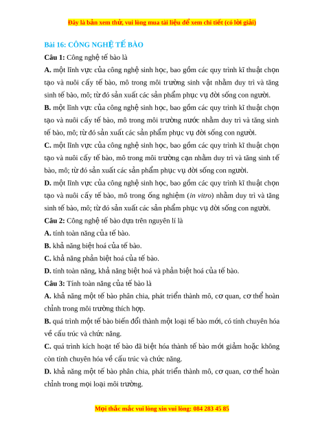Đây là bản xem th , vu ử i lòng mua tài li u ệ đ xe ể m chi ti t ế (có l i ờ gi i ả ) Bài 16: CÔNG NGH Ệ T B Ế ÀO Câu 1: Công ngh t ệ bào l ế à A. m t ô linh v c ư c a u công ngh ệ sinh h c, o bao g m ô cac quy trinh ki thu t â ch n o t o a và nuôi c y â t