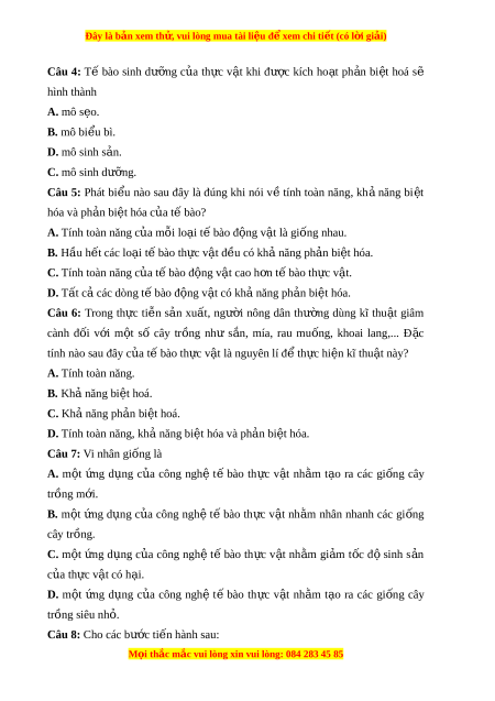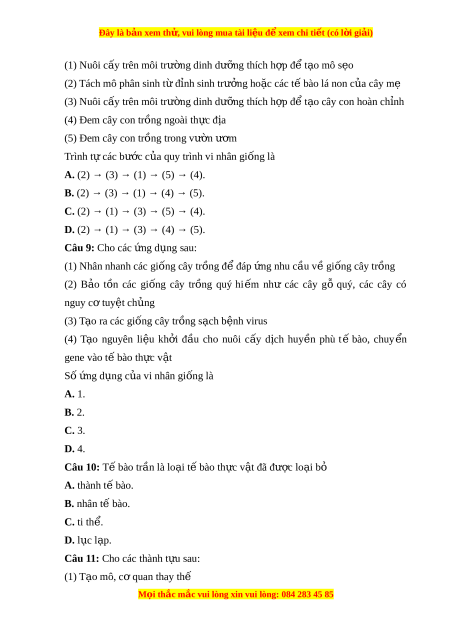 Câu 7: Vi nhân giông là A. m t ô ng ư d ng u c a u công ngh ệ t ế bào th c ư v t â nh m ă t o a ra cac gi ng ô cây trông m i ơ . B. m t ô ng ư d ng u c a u công ngh ệ t ế bào th c ư v t â nh m ă nhân nhanh cac gi ng ô cây trông. C. m t ô ng ư d ng u c a u công ngh ệ t ế bào th c ư v t â nh m ă gi m a t c ô đ ô sinh s n a c a u th c v ư t â co h i a . D. m t ô ng ư d ng u c a u công ngh ệ t ế bào th c ư v t â nh m ă t o a ra cac gi ng ô cây trông siêu nh . o Câu 8: Cho cac bư c t ơ i n hành s ế au: M i ọ thắc m c