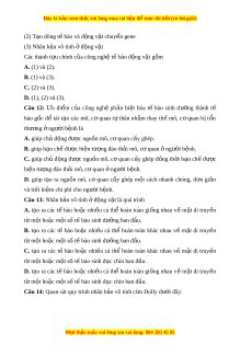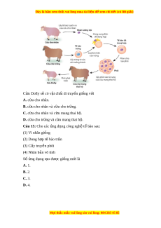 Đây là bản xem th , vu ử i lòng mua tài li u ệ đ xe ể m chi ti t (c ế ó l i ờ gi i ả ) (2) T o dong t a bào và đ ế ng ô v t â chuy n gene ể (3) Nhân b n vô t a ính đ ơ ng ô v t â Cac thành t u chí ư nh c a u công ngh t ệ bào đ ế ng v ô t â gôm A. (1) và (2). B. (1) và (3). C. (2) và (3). D. (1), (2) và (3). Câu 12: Ưu đi m ể c a u công ngh ệ ph n a bi t ệ hoa t ế bào sinh dư ng ỡ thành tế bào g c ô đ ể tai t o a cac mô, cơ quan t ư thân nh m ă thay th ế mô, c ơ quan b it n ô thư ng ơ ng ơ ư i ơ b nh l ệ à A. giup ch đ u ng đ ô ư c ngu ơ ôn mô, c quan ơ c y ghep. â B. giup h n ch a đ ế ư c hi ơ ện tư ng đào t ơ h i a mô, c quan ơ ng ơ ư i ơ b nh. ệ C. giup ch u đ ng ô đư c ơ ngu n ô mô, c ơ quan c y â ghep đ ng ô th i ơ h n a ch ế đư c ơ hiện tư ng đào ơ th i a mô, c quan ơ ng ơ ư i ơ b nh. ệ D. giup t o a ra ngu n ô mô, cơ quan c y â ghep m t ô cach nhanh chong, đ n ơ gi n a và ti t ế ki m ệ chi phí cho ngư i ơ b nh. ệ Câu 13: Nhân b n a vô tính ơ đ ng v ô t â là qua trinh A. t o a ra cac tế bào ho c ă nhi u ê ca th ể hoàn toàn gi ng ô nhau v ê m t ă di truy n ê t m ư t ô hoăc m t ô sô t bào ế sinh dư ng ban ỡ đ u. â B. t o a ra cac tế bào ho c ă nhi u