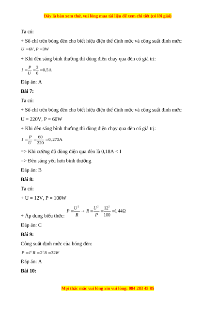 Bài 10: Bóng đèn có điện trở 9Ω và hiệu điện thế qua nó là 24V thì nó sáng bình