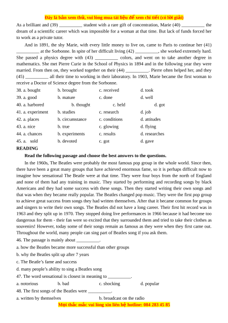 receive a Doctor of Science degree from the Sorbonne. 38. a. bought b. brought c. received d. took 39. a. good b. mature c. done d. well 40. a. harbored b. thought c. held d. got 41. a. experiment b. studies c. research d. job 42. a. places b. circumstance c. conditions d. attitudes 43. a. nice b. true c. glowing d. flying 44. a. chances b. experiments c. results d. researches 45. a. sold b. devoted c. got d. gave READING