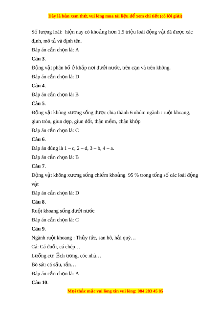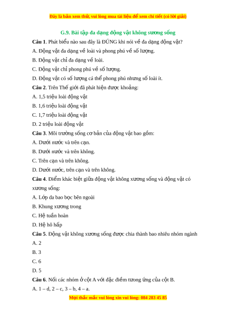 au đây là ĐÚNG khi nói v đa d ề ng ạ đ ng v ộ t ậ ? A. Đ ng v ộ t ậ đa d ng v ạ l ề oài và phong phú v s ề l ố ư ng. ợ B. Đ ng ộ v t ậ ch đa d ỉ ng ạ v l ề oài. C. Đ ng ộ v t ậ ch phong phú v ỉ s ề ố lư ng. ợ D. Đ ng v ộ t ậ có số lư ng cá ợ thể phong phú nh ng s ư l ố oài ít. Câu 2. Trên Th gi ế i ớ đã phát hi n đ ệ ư c kho ợ ng: ả A. 1,5 tri u l ệ oài đ ng v ộ t ậ B. 1,6 tri u l ệ oài đ ng v ộ t ậ C. 1,7 tri u l ệ oài đ ng v ộ t ậ D. 2 tri u l ệ oài đ ng v ộ t ậ Câu 3. Môi trư ng s ờ ống cơ b n c ả a ủ đ ng v ộ t ậ bao g m ồ : A. Dư i ớ nư c ớ và trên c n. ạ B. Dư i ớ nư c và t ớ rên không. C. Trên c n ạ và trên không. D. Dư i ớ nư c, ớ trên c n và t ạ rên không. Câu 4. Đi m ể khác bi t ệ gi a đ ữ ng v ộ t ậ không xư ng s ơ ng và ố đ ng v ộ t ậ có xư ng s ơ ống: A. L p da bao b ớ c bên ngoài ọ B. Khung xư ng ơ trong C. Hệ tuần hoàn D. Hệ hô hấp Câu 5. Đ ng v ộ t ậ không xư ng s ơ ống đư c