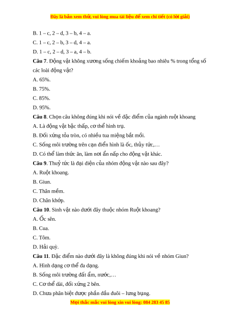 D. 1 – c, 2 – d, 3 – a, 4 – b. Câu 7. Đ ng v ộ t ậ không xư ng s ơ ống chi m ế kho ng ả bao nhiêu % trong t ng s ổ ố các loài đ ng ộ v t ậ ? A. 65%. B. 75%. C. 85%. D. 95%. Câu 8. Ch n câu ọ không đúng khi nói v đ ề c đi ặ m ể c a ủ ngành ru t ộ khoang A. Là đ ng ộ v t ậ b c ậ th p, c ấ ơ th hì ể nh tr . ụ B. Đối x ng t ứ a t ỏ ròn, có nhi u t ề ua mi ng b ệ t ắ m i ồ . C. Sống môi trư ng ờ trên c n ạ đi n hì ể nh là c, t ố h y t ủ c,… ứ D. Có th l ể àm th c ứ ăn, làm n i ơ n n ẩ p cho ấ đ ng v ộ t ậ khác. Câu 9. Thu t ỷ c l ứ à đ i ạ di n c ệ a ủ nhóm đ ng v ộ t ậ nào sau đây? A. Ru t ộ khoang. B. Giun. C. Thân m m ề . D. Chân kh p. ớ Câu 10. Sinh v t ậ nào dư i ớ đây thu c nhóm ộ Ru t ộ khoang? A. Ốc sên. B. Cua. C. Tôm. D. H i ả quỳ. Câu 11. Đặc đi m ể nào dư i