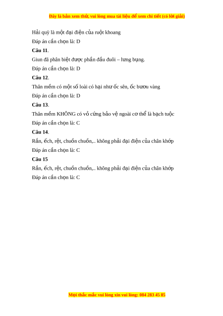 ể nào không đúng khi nói v nhóm ề Thân m m ề ? A. C t ơ hể m m ề , thư ng ờ có v đá vôi ỏ bao b c. ọ B. Số lư ng l ợ oài l n, khác ớ nhau v hì ề nh d ng, kí ạ ch thư c. ớ C. Đ i ạ di n ệ : trai, c, h ố n, s ế ò,… D. Đ u l ề à nh ng s ữ inh v t ậ có l i ợ , cung c p t ấ h c ứ ăn. Câu 13. Thân m m ề nào KHÔNG có v c ỏ ng b ứ o ả v ngoài ệ c t ơ hể A. Sò. B. Ốc sên. C. B ch t ạ u c. ộ D. Ốc v n. ặ Câu 14. Đ c ặ đi m