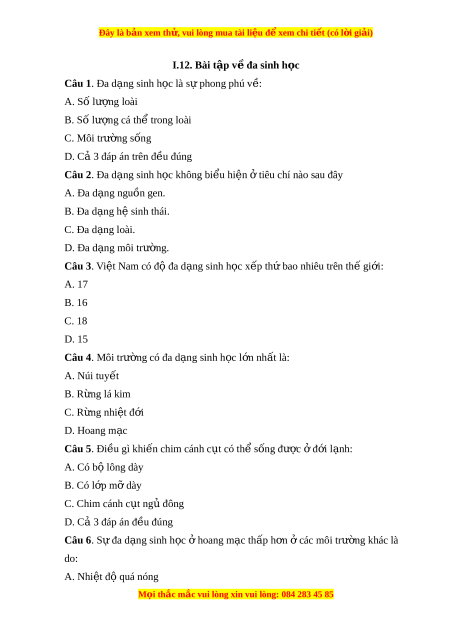 I.12. Bài tập v đa s ề inh h c ọ Câu 1. Đa d ng ạ sinh h c l ọ à s phong phú v ự : ề A. Số lư ng ợ loài B. Số lư ng cá t ợ hể trong loài C. Môi trư ng ờ sống
