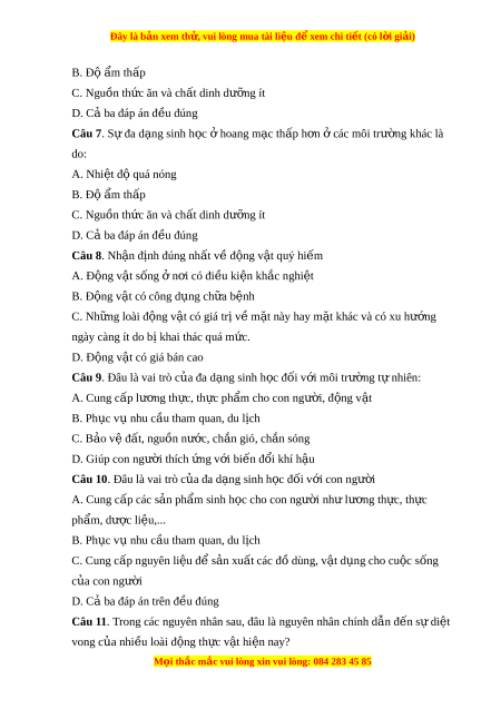 Câu 10. Đâu là vai trò c a đa d ủ ng ạ sinh h c ọ đ i ố v i ớ con ngư i ờ A. Cung cấp các s n ả ph m ẩ sinh h c cho con ng ọ ư i ờ nh l ư ư ng t ơ h c, ự th c ự ph m ẩ , dược li u,... ệ B. Ph c v ụ ụ nhu c u t ầ ham quan, du l ch ị C. Cung c p nguyên l ấ i u đ ệ ể s n ả xu t ấ các đ dùng, v ồ t ậ d ng cho cu ụ c ộ s ng ố c a con ng ủ ư i ờ