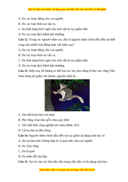 C. Do khả năng thích nghi c a s ủ inh v t ậ b s ị uy gi m ả d n. ầ D. Do các lo i ạ dịch b nh b ệ t ấ thư ng. ờ Câu 13. Hi n nay s ệ ố lư ng cá ợ th l ể oài sóc bay đen tr ng ắ khu v ở c r ự ng ừ Vi t ệ Nam đang s t ụ gi m ả r t ấ nhanh, nguyên nhân là: A. Săn b t ắ ,buôn bán trái phép B. Phá r ng, khai ừ thác gỗ k theo quy đ nh ị C. Xả chất th i ả công nghi p khi ệ ch a đ ư ư c ợ x l ử i