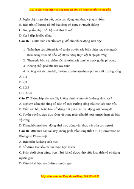 Câu 17. Biện pháp nào sau đây không ph i ả là b o v ả đa d ệ ng ạ sinh h c? ọ A. Nghiêm c m ấ phá r ng đ ừ b ể o v ả m ệ ôi trư ng ờ s ng c ố a ủ các loài sinh v t ậ . B. Cấm săn b t ắ , buôn bán, s d ử ng t ụ rái phép các loài đ ng v ộ t ậ hoang dã. C. Tuyên truy n, gi ề áo d c ụ r ng r ộ ãi trong nhân dân đ m ể i ọ ngư i ờ tham gia b o ả vệ r ng. ừ D. D ng h ừ t ế m i ọ ho t ạ đ ng khai ộ thác đ ng v ộ t ậ , th c v ự t ậ c a con ng ủ ư i ờ . Câu 18. M c