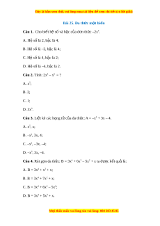 Đây là bản xem th , vu ử i lòng mua tài li u ệ đ xe ể m chi ti t ế (có l i ờ gi i ả ) Bài 25. Đa th c ứ m t ộ bi n ế Câu 1. Cho bi t ế hệ số và bậc c a ủ đ n t ơ h c –2x ứ 4. A. Hệ số là 2, b c ậ là 4;