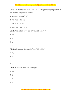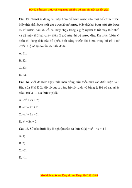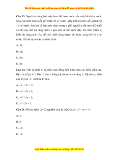 Đây là bản xem th , vu ử i lòng mua tài li u ệ đ xe ể m chi ti t ế (có l i ờ gi i ả ) Câu 13. Ngư i ờ ta dùng hai máy b m ơ để b m ơ nư c ớ vào m t ộ bể ch a ứ nư c. ớ Máy thứ nhất b m ơ mỗi gi đ ờ ư c ợ 20 m3 nư c. ớ Máy thứ hai b m ơ m i ỗ giờ đư c ợ 15 m3 nư c. ớ Sau khi cả hai máy ch y ạ trong x gi , ờ ngư i ờ ta t t ắ máy th ứ nh t ấ và để máy thứ hai ch y ạ thêm 2 giờ n a ữ thì bể nư c ớ đ y ầ . Đa th c ứ (bi n ế x) bi u ể thị dung tích c a ủ bể (m3), bi t ế r ng ằ trư c ớ khi b m ơ , trong bể có 1 m3 nư c. H ớ ệ số tự do c a đa t ủ h c đó l ứ à: A. 31; B. 32; C. 33; D. 34. Câu 14. Vi t ế đa th c ứ F(x) th a ỏ mãn đ ng ồ th i ờ th a ỏ mãn các đi u ề ki n ệ sau: B c ậ c a ủ F(x) là 2; Hệ số c a ủ x b ng ằ hệ số t ự do và b ng ằ 2; H ệ s ố cao nh t ấ c a F( ủ x) là –1. Đa th c F ứ (x) là: A. –x2 + 2x + 2; B. –x2 – 2x + 2; C. –x2 + 2x – 2; D. x2 + 2x + 2.