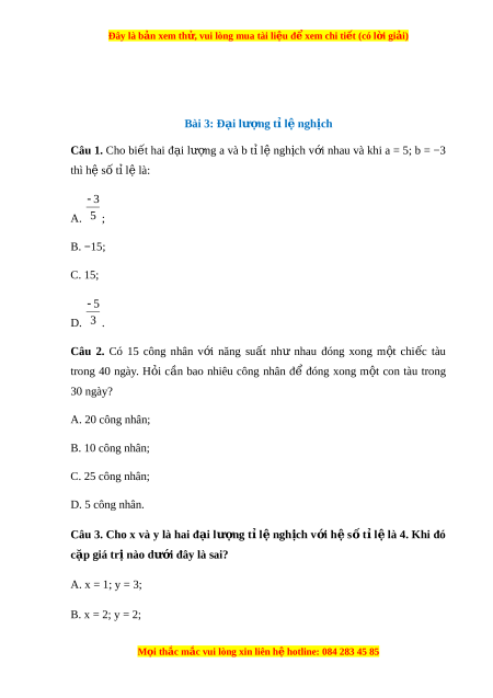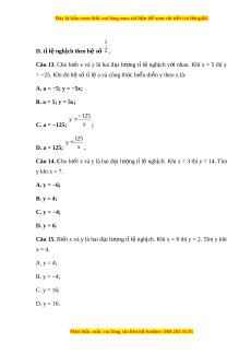 Đây là bản xem th , vu ử i lòng mua tài li u ệ đ xe ể m chi ti t ế (có l i ờ gi i ả ) Bài 3: Đ i ạ lư ng t ợ l ỉ ngh ệ ch ị Câu 1. Cho bi t ế hai đ i ạ lư ng ợ a và b t ỉl ệ ngh ch ị v i
