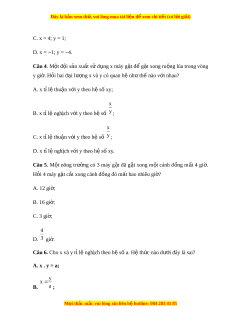 D. x = −1; y = −4. Câu 4. M t ộ đ i ộ s n ả xu t ấ s d ử ng ụ x máy g t ặ đ ể g t ặ xong ru ng ộ lúa trong vòng y gi . H ờ i ỏ hai đ i ạ lư ng x và y có quan ợ h nh ệ ư thế nào v i ớ nhau? A. x tỉ l t ệ hu n ậ v i ớ y theo h s ệ xy; ố x B. x tỉ lệ nghịch v i ớ y theo h s ệ ố y ; x C. x tỉ lệ thu n v ậ i ớ y theo h s ệ ố y ; D. x tỉ l ngh ệ ch v ị i ớ y theo h s ệ ố xy. Câu 5. M t ộ nông trư ng ờ có 3 máy g t ặ đã g t ặ xong m t ộ cánh đ ng ồ m t ấ 4 gi . ờ H i ỏ 4 máy g t ặ c t
