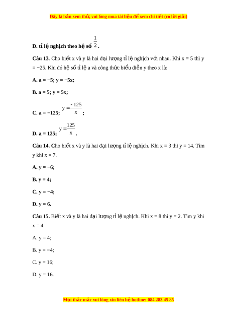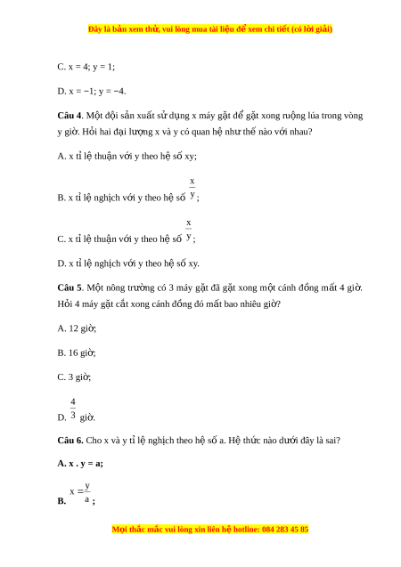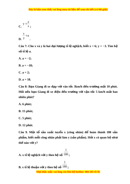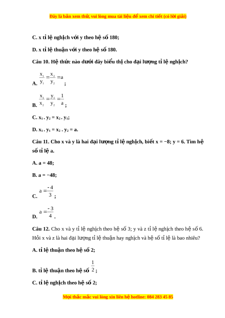 Đây là bản xem th , vu ử i lòng mua tài li u ệ đ xe ể m chi ti t ế (có l i ờ gi i ả ) C. x t l ỉ n ệ gh ch v ị i ớ y theo h s ệ 180; ố D. x t l ỉ t ệ hu n v ậ i ớ y theo h s ệ 180. ố Câu 10. H t ệ h c nào d ứ ư i ớ đây bi u t ể h cho đ ị i ạ lư ng t ợ l ỉ ngh ệ ch? ị x x 1 2 a A. y y 1 2 ; x y 1 1 1 B. x y a 2 2 ; C. x1 . y2 = x2 . y1;