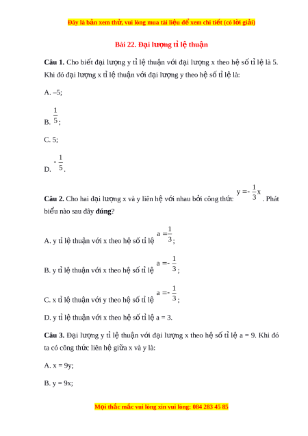 Bài 22. Đại lư ng t ợ l ỉ t ệ hu n ậ Câu 1. Cho bi t ế đ i ạ lư ng ợ y tỉ lệ thu n ậ v i ớ đ i ạ lư ng ợ x theo h ệ s ố t ỉl ệ là 5. Khi đó đ i ạ lư ng ợ x t l ỉ t ệ hu n v ậ i ớ đ i ạ lư ng y t ợ heo h s ệ t ố l ỉ l ệ à: A. –5; 1 B. 5 ; C. 5; 1 D. 5 . 1 y x Câu 2. Cho hai đ i ạ lư ng ợ x và y liên h ệ v i ớ nhau b i ở công th c ứ 3 . Phát bi u nào s ể au đây đúng? 1 a A. y tỉ l t ệ hu n ậ v i ớ x theo h s ệ t ố l ỉ ệ 3 ; 1 a B. y tỉ lệ thu n v ậ i ớ x theo h s ệ ố t l ỉ ệ 3 ; 1 a C. x tỉ lệ thu n v ậ i ớ y theo h s ệ ố t l ỉ ệ 3 ; D. y tỉ l t ệ hu n ậ v i ớ x theo h s ệ t ố l ỉ a ệ = 3. Câu 3. Đ i ạ lư ng ợ y tỉ lệ thu n ậ v i ớ đ i ạ lư ng ợ x theo h ệ s ố t ỉlệ a = 9. Khi đó ta có công th c l ứ iên h gi ệ a ữ x và y là: A. x = 9y; B. y = 9x; M i