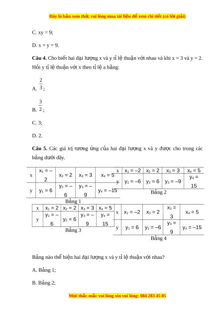 Đây là bản xem th , vu ử i lòng mua tài li u ệ đ xe ể m chi ti t ế (có l i ờ gi i ả ) C. xy = 9; D. x + y = 9. Câu 4. Cho bi t ế hai đ i ạ lư ng x và y t ợ ỉ l t ệ hu n v ậ i