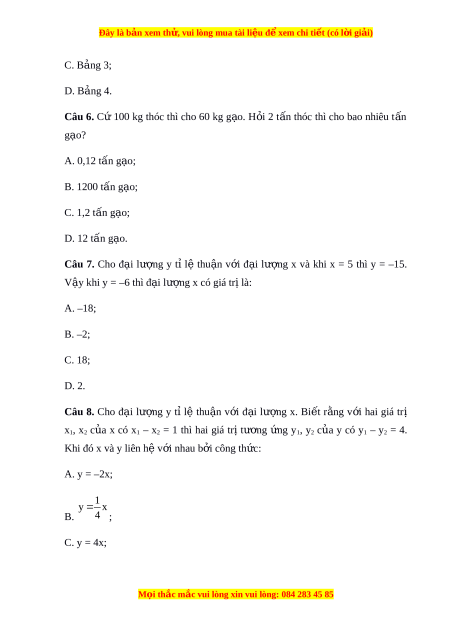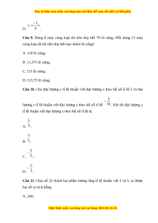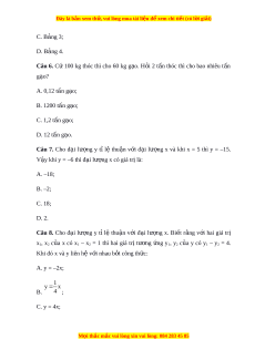 ấ thóc thì cho bao nhiêu t n ấ g o? ạ A. 0,12 tấn g o; ạ B. 1200 tấn g o; ạ C. 1,2 tấn g o; ạ D. 12 tấn g o. ạ Câu 7. Cho đ i ạ lư ng ợ y tỉ lệ thu n ậ v i ớ đ i ạ lư ng