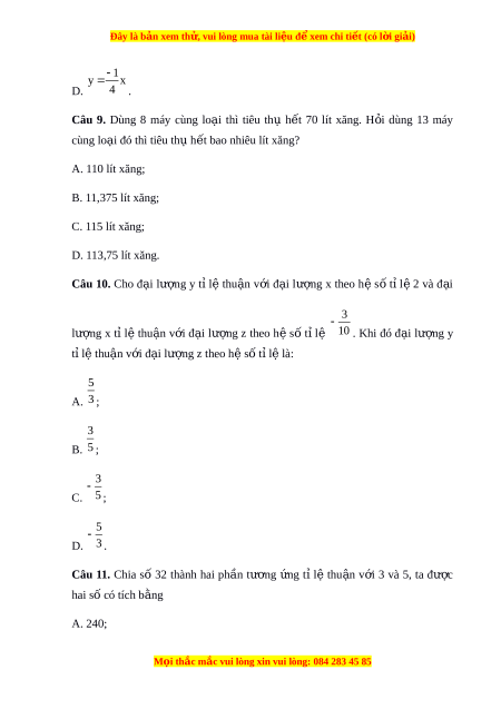 Câu 9. Dùng 8 máy cùng lo i ạ thì tiêu thụ h t ế 70 lít xăng. H i ỏ dùng 13 máy cùng lo i ạ đó thì tiêu th h ụ t ế bao nhiêu lít xăng? A. 110 lít xăng; B. 11,375 lít xăng; C. 115 lít xăng; D. 113,75 lít xăng. Câu 10. Cho đ i ạ lư ng ợ y tỉ lệ thu n ậ v i ớ đ i ạ lư ng ợ x theo h ệ s ố t ỉl ệ 2 và đ i ạ 3 lư ng ợ x tỉ lệ thu n ậ v i ớ đ i ạ lư ng ợ z theo h ệ s