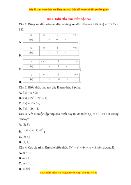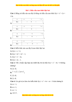 Đây là bản xem th , vu ử i lòng mua tài li u ệ đ xe ể m chi ti t ế (có l i ờ gi i ả ) Bài 1. Dấu c a t ủ am th c b ứ c hai ậ Câu 1. B ng ả xét d u nào s ấ au đây là b ng ả xét d u ấ c a ủ tam th c f ứ (x) = x2 + 2x + 1 là: A. ; B. ; C. ; D. . Câu 2. Bi u t ể h c